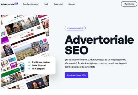 Advertoriale.pro conecteaza advertiserii cu publisherii pentru publicarea de articole SEO, comunicate de presa si PR. Platforma utilizeaza tehnologii moderne, oferind sisteme automatizate de facturare, email si SMS, asigurand eficienta si performanta in marketingul online.